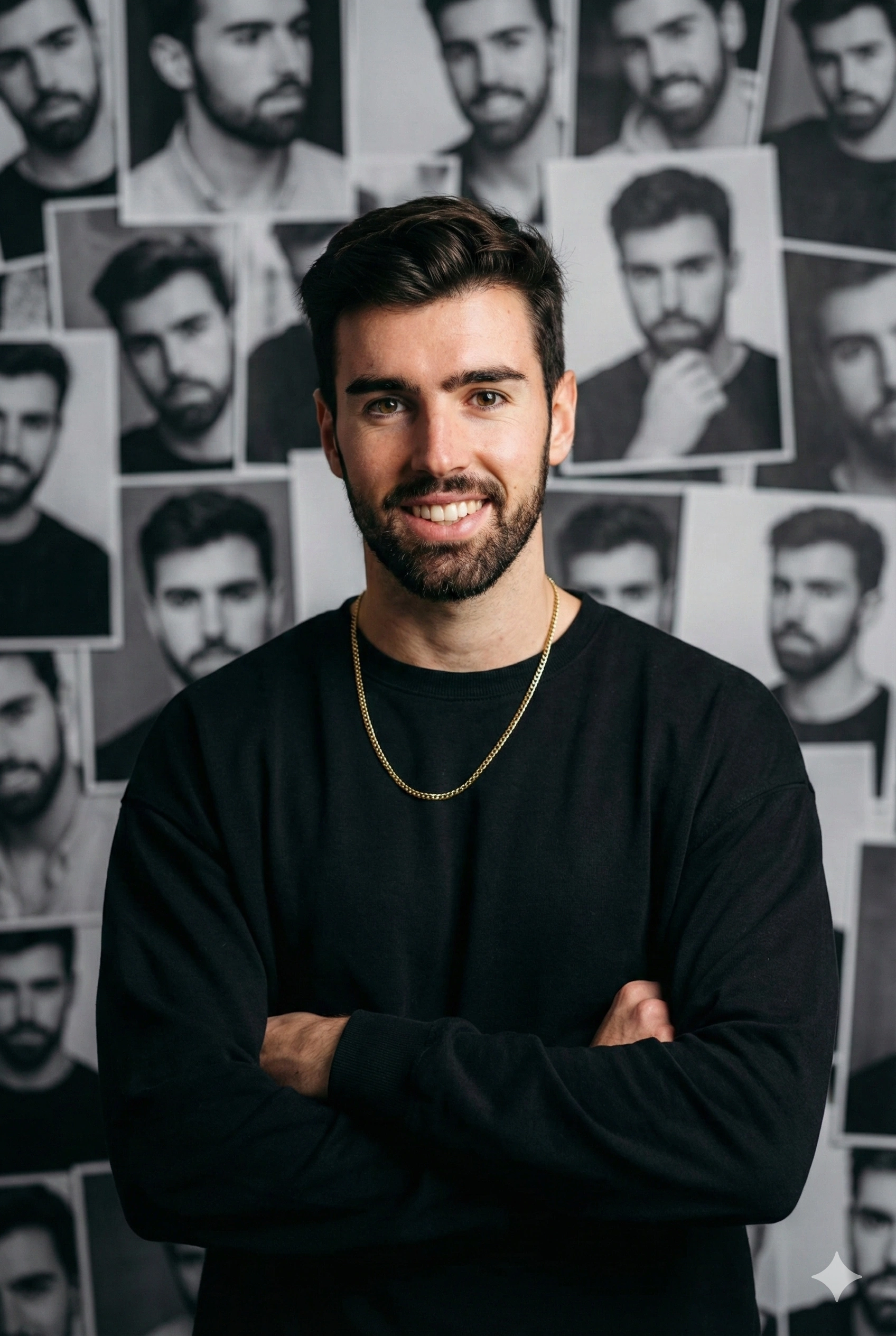 “A hyper-realistic 8k medium shot captured with a straight-on camera angle and a slightly wide lens. The main subject stands in the foreground with arms crossed, looking directly into the camera with a confident, natural smile, using the uploaded face at full accuracy as the reference. They wear a black oversized shirt with soft, realistic fabric drape, paired with a reflective gold chain that catches subtle highlights. Textures remain crisp and true to life. Cinematic lighting with a soft frontal key light brightens the face and shirt evenly, adding gentle contouring shadows that enhance realism without overpowering the expression. Behind the subject is a dense, wall-like collage of black and white portrait photos of the same person. The portraits overlap in slightly tilted layers, creating a textured monochrome backdrop. The background portraits are sharp but rendered in a slightly softer focus than the subject to reinforce depth of field. The main subject is in full colour while the collage remains monochrome, providing a clean Photoshop-style contrast that clearly separates the foreground and background.”
