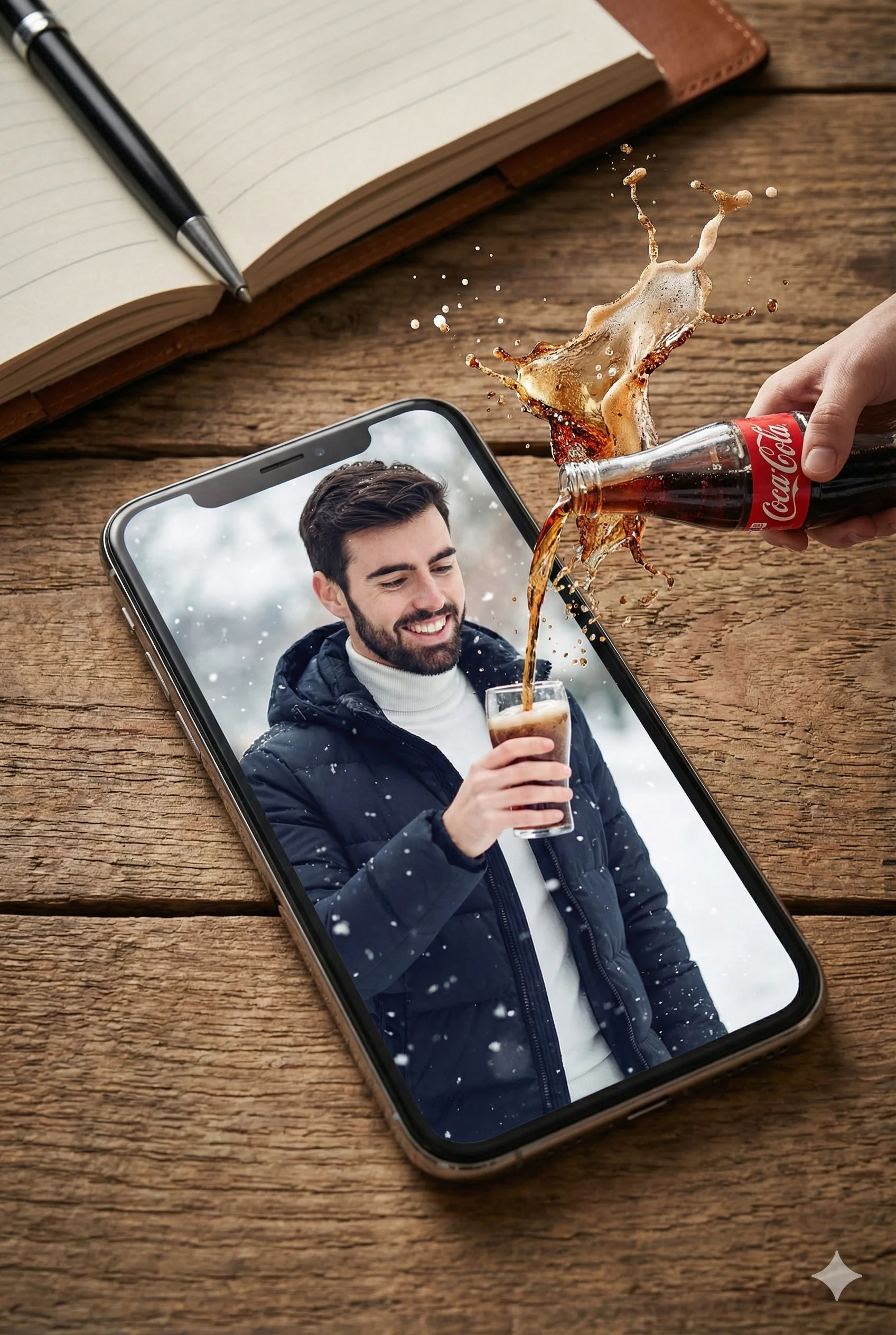 “A photorealistic, highly detailed image featuring a young man with a warm smile, wearing a dark puffer jacket over a white turtleneck, standing in a snowy winter landscape. The scene is displayed on a modern smartphone screen resting on a rustic wooden table next to a notebook and a pen. The main subject, the man and the beverage, dramatically breaks the screen boundary (3D pop-out effect): a hand from outside the screen is pouring Coca-Cola from a glass bottle directly into a glass held by the man inside the screen, resulting in a dynamic splash and realistic liquid movement. The glass and the splash are rendered with high realism and dramatic lighting, popping out of the phone’s bezel. Cinematic lighting, hyperrealism, 8k resolution, deep depth of field, sharp focus, digital art, high-contrast.”