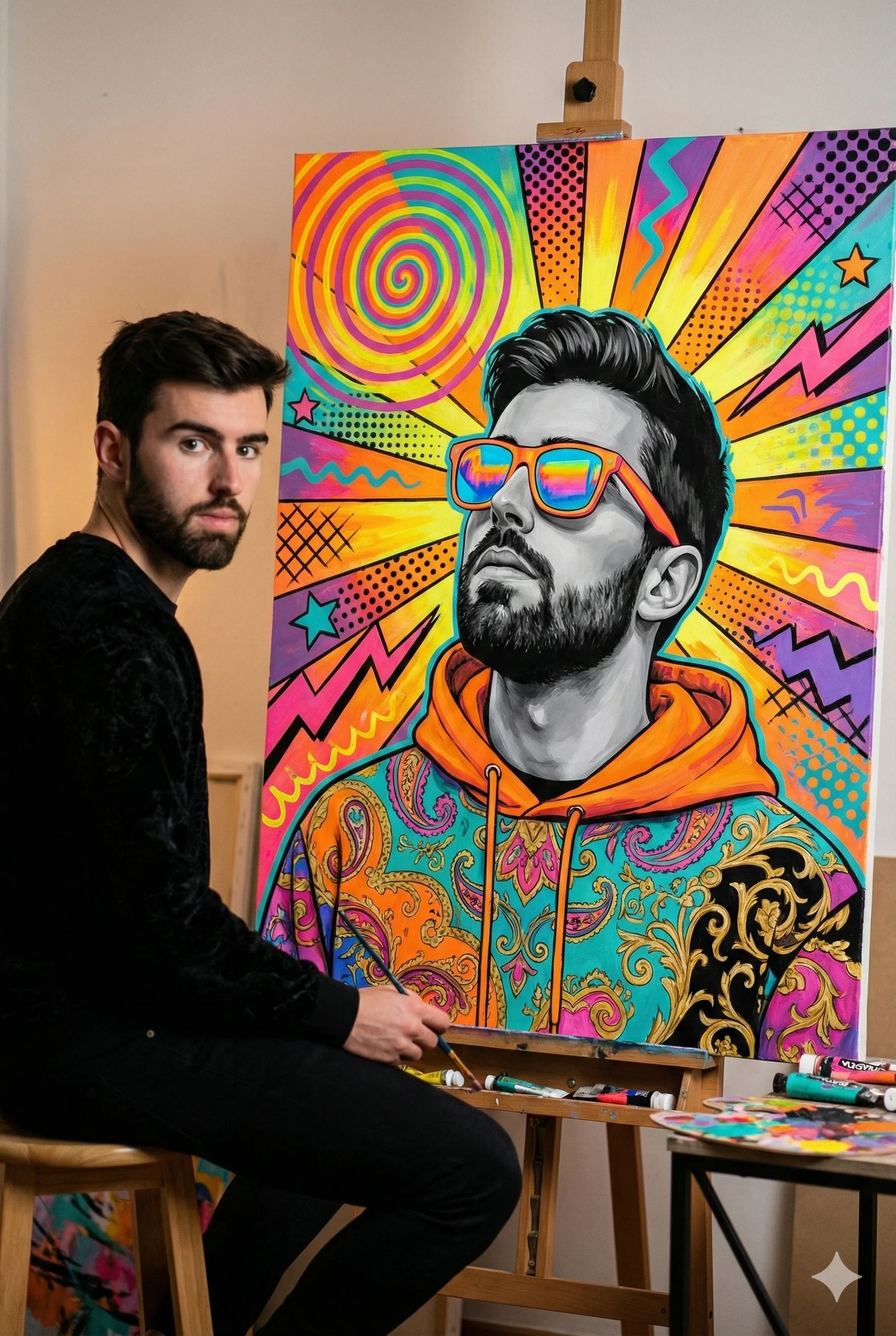“Create a hyper-realistic scene of a man sitting on the left side of the frame, using the uploaded reference photo for the man’s face and likeness. He should look exactly like the reference image with accurate facial structure, expression and realism. He is seated on a simple stool or chair, angled slightly toward the canvas on his right. He holds a paintbrush in his hand, resting it casually near the canvas as if he’s mid-session. Canvas Artwork (Bright Colourful Pop-Art) The canvas on the right side of the frame shows a bold, colourful pop-art portrait of the same man. The painting includes: A realistic grayscale portrait looking upward at about 45 degrees Oversized sunglasses with neon orange, electric blue, hot pink reflective colours. A hoodie or jacket with multi-colour paisley/baroque patterns (orange, teal, pink, purple, gold, black). A vibrant orange hood underneath Lower area with vivid painted fabric textures in orange, magenta, turquoise. Pop-Art Background Patterns (On the Canvas) Use a high-energy mix of: Neon spirals Radiating sunbursts Comic halftone dots Lightning zig-zags Stars Wavy lines Crosshatching Brushstroke textures All in bright colours like orange, yellow, pink, purple, teal and black, layered together to feel hand-painted and explosive. Scene Environment: The man sits comfortably on the left. The canvas is on the right, facing him. He holds a paintbrush near the canvas. Paint tubes, colour palettes and brushes scattered around. Warm, soft studio lighting. Visible canvas texture and real acrylic paint strokes. Style: Hyper-realistic man Canvas art is colourful pop-art with bold outlines and layered paint textures. High saturation, strong contrast, energetic vibe. Negative Prompt: No cartoon bodies, no flat vector look, no distortions, no muted colours.”