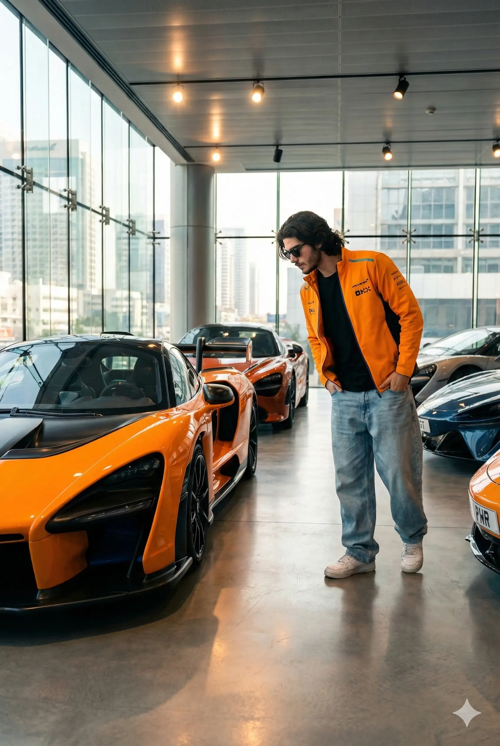 “Use the uploaded photo as the identity reference. Create a full-body scene of the same man inside a luxury McLaren showroom. Keep his exact face, hairstyle, sunglasses, outfit posture, and overall style, but remove the headphones. He wears an orange McLaren racing jacket, black shirt, loose light-wash baggy jeans, and white sneakers. Place an orange-and-black McLaren hypercar on the left side of the frame and position the man on the right, slightly leaning forward as he examines the car. Surround the space with additional McLaren supercars in a clean, modern showroom with polished concrete floors and floor-to-ceiling glass windows. Keep the lighting soft and natural with warm indoor spotlights. Make the scene realistic, sharp, and photogenic, matching the mood and quality of the reference photo.”
