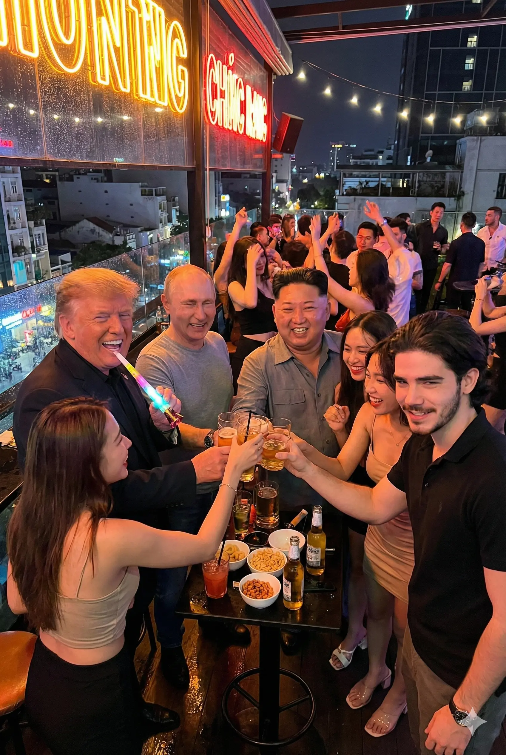 “Rooftop sky bar in Saigon at night with warm air, loud music, neon reflections, and a proper party atmosphere. A small VIP table is stacked with cocktails, beers, shots, mixers, and bar snacks. The four men sit in the same positions as the reference. • Left seat: Donald Trump, recognisable hair, light skin, wearing a lightweight black jacket or open-collar shirt, laughing hard while holding a fun party prop instead of the guitar. • Middle-left seat: Vladimir Putin, short hair, light skin, in a simple grey breathable T-shirt, caught mid-laugh with a lively expression. • Middle-right seat: Kim Jong-un, neat hairstyle, light grey rolled-sleeve shirt, smiling big and clearly enjoying the chaos. • Right seat: the man from the uploaded reference photo, no hat, black polo shirt, raising his drink toward the camera with a cheeky grin. A few Saigon sky-bar girls are with them, dressed for the heat in black or grey crop tops, sleeveless tops, fitted dresses, or light clubwear that matches the leaders’ tones. They lean in, clink glasses, dance a little, laugh loud, and blend seamlessly into the hype. The whole scene feels wild, energetic, fun, and messy in the best way, like a candid iPhone party photo taken mid-night.”