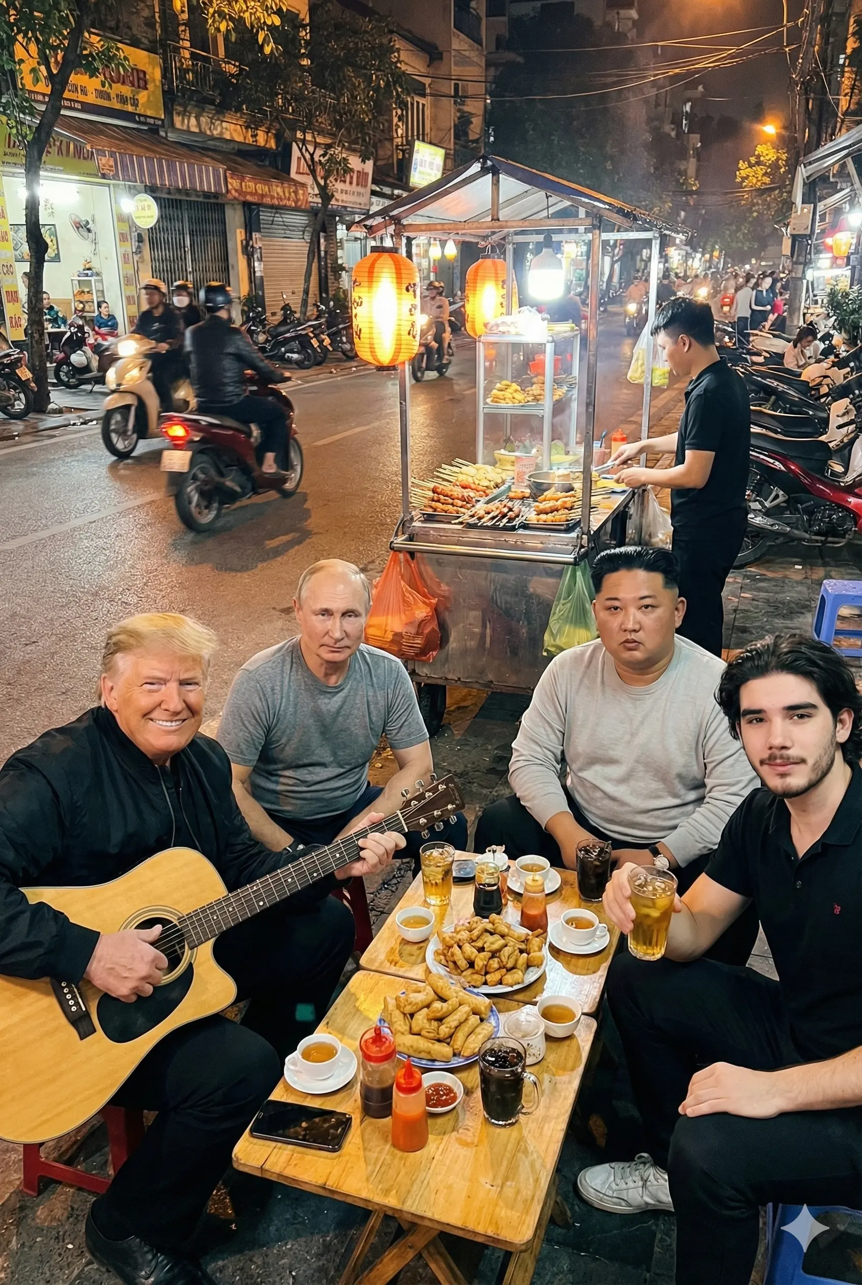 “Nighttime Vietnamese street-food stall scene on a busy roadside in Hanoi. A small low wooden table in the centre is filled with classic Vietnamese snacks: nem rán, bánh gối, fried platters, quail eggs, dipping sauces, and hot glasses of đen đá and trà nóng. Four men sit tightly around the table in the exact positions from the reference. • Left seat: Donald Trump with his recognisable hairstyle, light skin, wearing a casual black jacket, smiling softly, holding an acoustic guitar on his lap exactly like the reference pose. • Middle-left seat: Vladimir Putin, short hair, light skin, wearing a simple grey T-shirt, sitting upright with a firm expression, looking directly at the camera. • Middle-right seat: Kim Jong-un, round face, neat hairstyle, wearing a light grey long-sleeve shirt, calm expression, positioned exactly like the older man in the reference image. • Right seat: the man from the uploaded reference photo, no hat, wearing a black polo shirt, holding up a glass of trà đá toward the camera. Behind them is a warm lantern-lit Vietnamese street-food cart with skewers, chả xiên, bánh tôm, and trays of fried snacks. Motorbikes pass in light motion blur, creating that lively Hanoi night-market vibe. Shot like an iPhone night photo. Realistic, gritty, warm, and cinematic.”