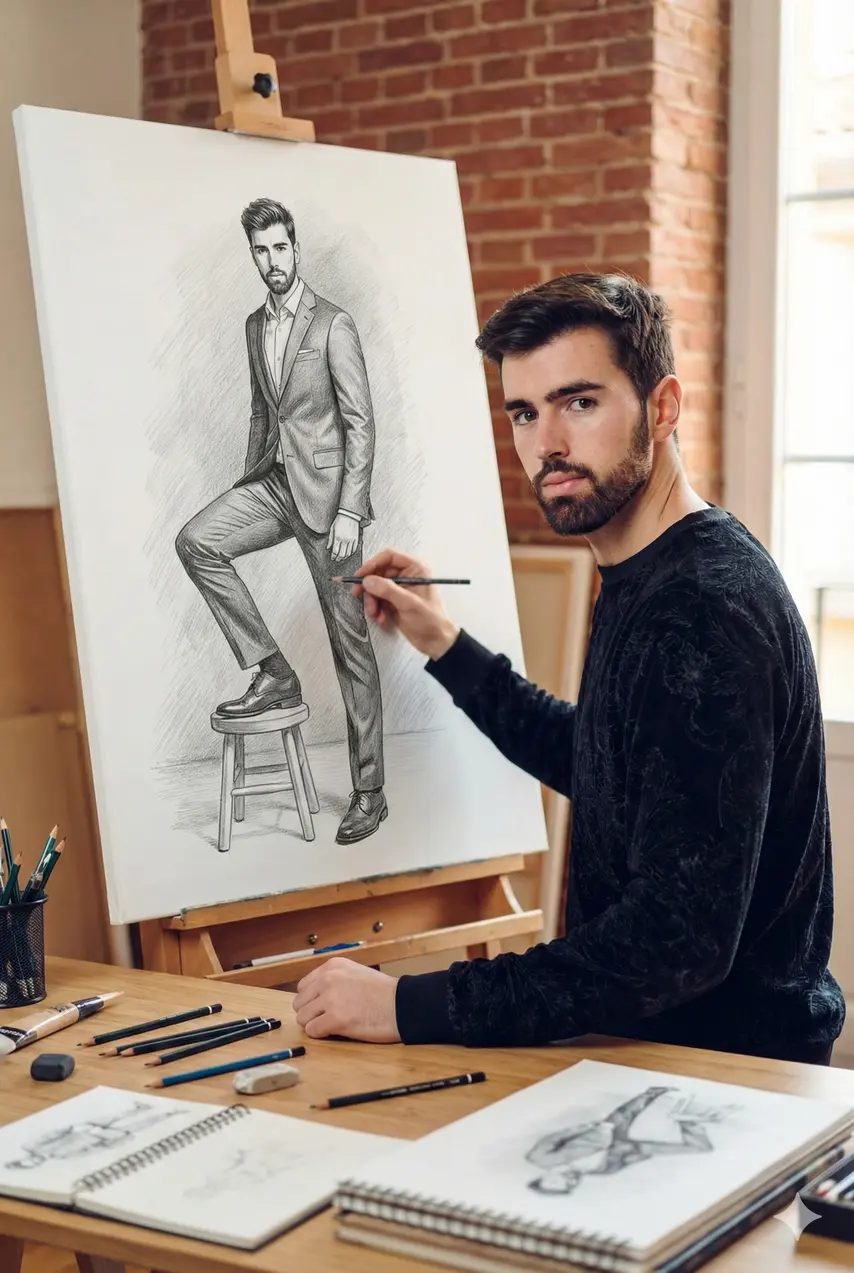 “Scene showing a real person from the uploaded photo sitting at an artist desk, drawing on a canvas. The real person has a confident, focused posture, sitting upright with calm intention. On the canvas, show a black and white graphite pencil drawing of the same person in a full-figure power posture on a simple stool. The canvas artwork looks hand drawn with textured pencil strokes, soft shading, detailed suit folds, and natural hair texture. Create a clear contrast so the real person looks lifelike and the figure on the canvas looks like a graphite pencil illustration.”
