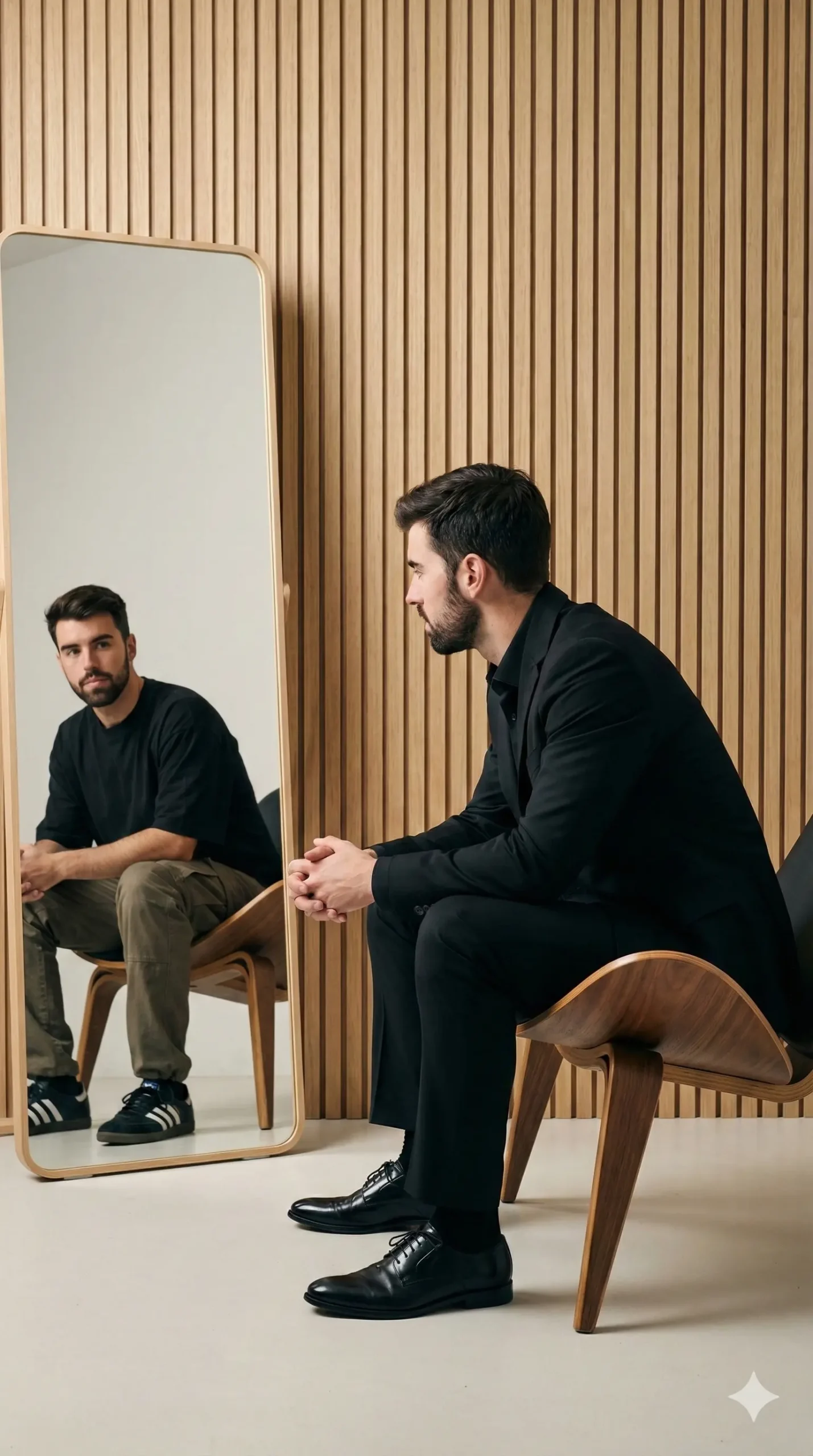 “Subject: [Person in the uploaded photo] sits side-on in a minimalist studio on a molded wood lounge chair with vertical wood slat walls and a neutral floor. They look toward a full-length mirror on the left. In the mirror, the subject appears in a different outfit and is seated on a similar chair, turned three-quarters toward camera. Camera and Style: Vertical portrait, 9:16, medium-full seated profile. Full-frame mirrorless camera, 35 mm lens at f/1.4, 1/125 s, ISO 400, warm white balance, eye-level static angle. Warm natural grade, medium contrast, restrained saturation, clean editorial feel. Composition: Mirror positioned on the left third, subject on the right third. Strong vertical lines from wooden slats. Balanced spacing between subject and reflection. Bare floor foreground, chairs and slat wall background. Clean negative space above. Lighting: Soft diffused key from camera left, gentle fill, subtle rim from bounce, no harsh shadows. Crisp detail on wood and clothing. Pose: Torso leaned slightly forward, elbows near the knees, hands clasped. Head turned left toward the mirror. Calm and thoughtful expression directed at the reflection. Outfits: • Real-world subject: black suit, black dress shirt, clean tailored fit, polished black dress shoes.• Mirror subject: black oversized T-shirt, relaxed cargo pants, Adidas sneakers with clear three-stripe design. Post and Quality: Accurate perspective with straight verticals, crisp detail, subtle vignette, soft noise reduction. Negative Prompts: watermark, text artifacts, banding, oversoftened skin, extra limbs, misaligned stripes, distorted logos, mirror mismatch. Do not change the subject’s facial features.”