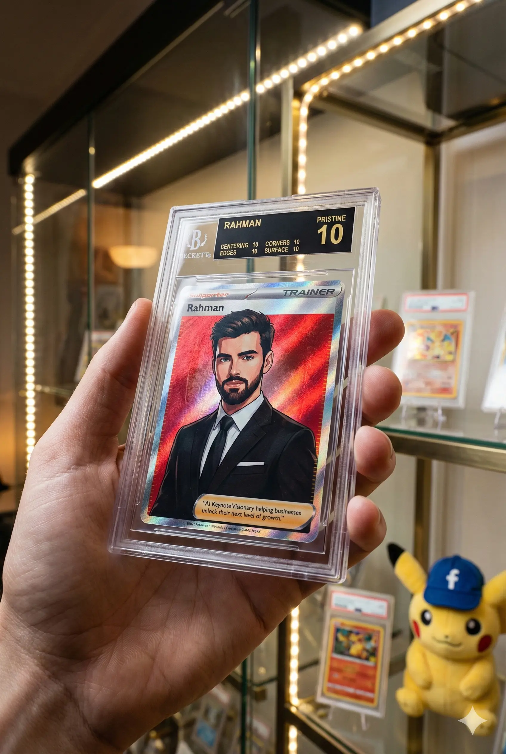 “A close-up collectible product shot showing a hand holding a thick, clear acrylic BGS-style grading slab that contains a rare holographic Full Art Pokémon-style card based on the uploaded person’s photo. The character on the card must be wearing a sharp black suit, and the illustration must match the uploaded person exactly, including facial structure, expression and hair, translated into a high-end Full Art artwork. The slab features a black Rahman label marked PRISTINE 10 with clear, readable subgrades. The holographic card surface has a vivid red foil effect that catches bright showcase lighting from above. In the background, create a premium collector environment with softly blurred glass display cases, warm spotlight reflections, and several graded cards arranged on elevated stands. Add subtle metallic shelving, a clean dark tabletop, and the soft glow of LED strips to give the scene a high-end showroom feel. A small Pikachu plush wearing a blue Facebook cap sits quietly in the corner for a nostalgic touch. Use macro product photography with vertical framing, high clarity, sharp focus on the slab’s reflective edges and foil texture, and an overall polished, premium aesthetic. Add this flavour line on the card: “AI Keynote Visionary helping businesses unlock their next level of growth.”